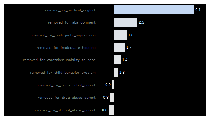 Black and other non-white children were over 6 times as likely to be removed for medical neglect, 2.5 times as likely to be removed for abandonment, and nearly twice as likely to be removed for inadequate supervision or housing issues.